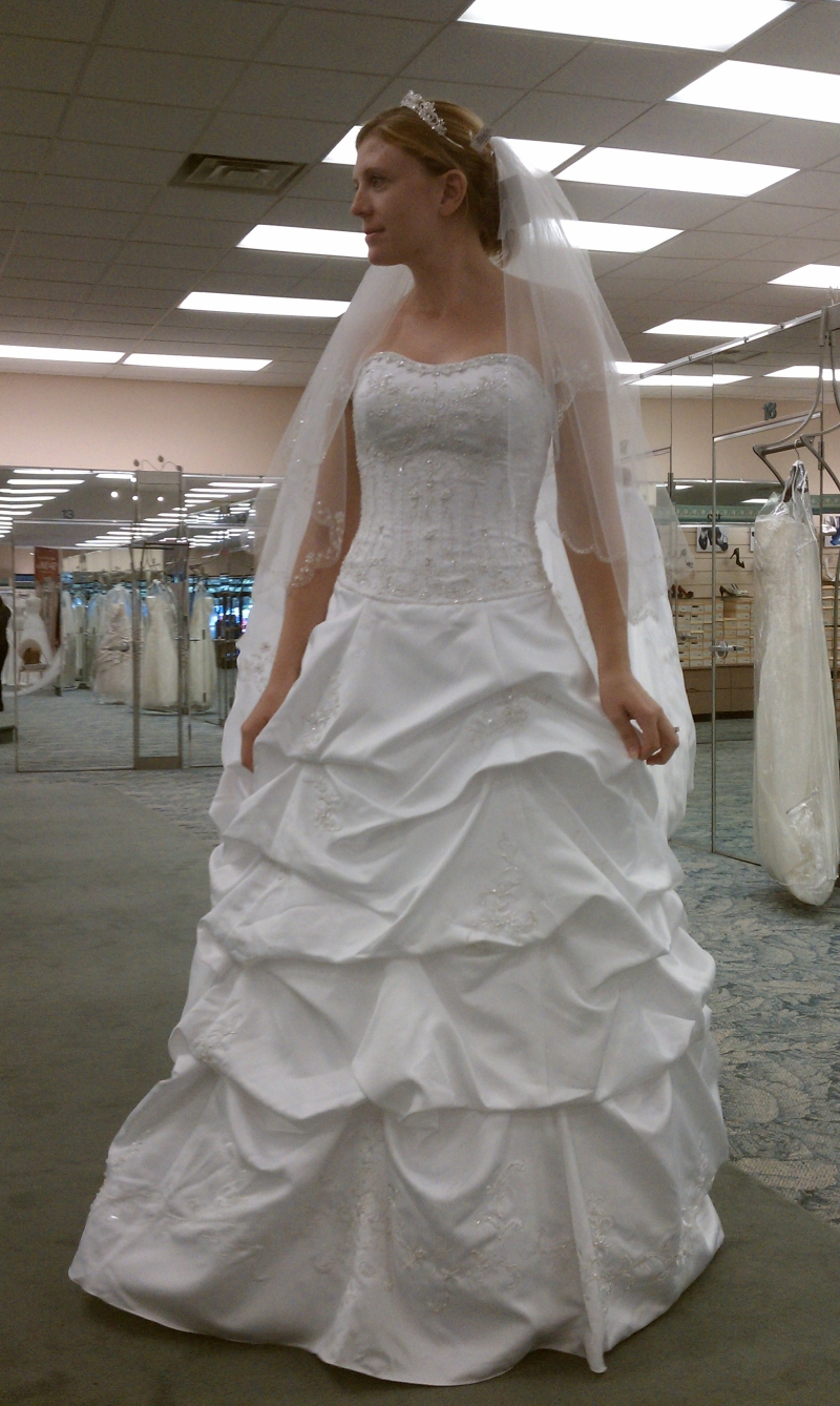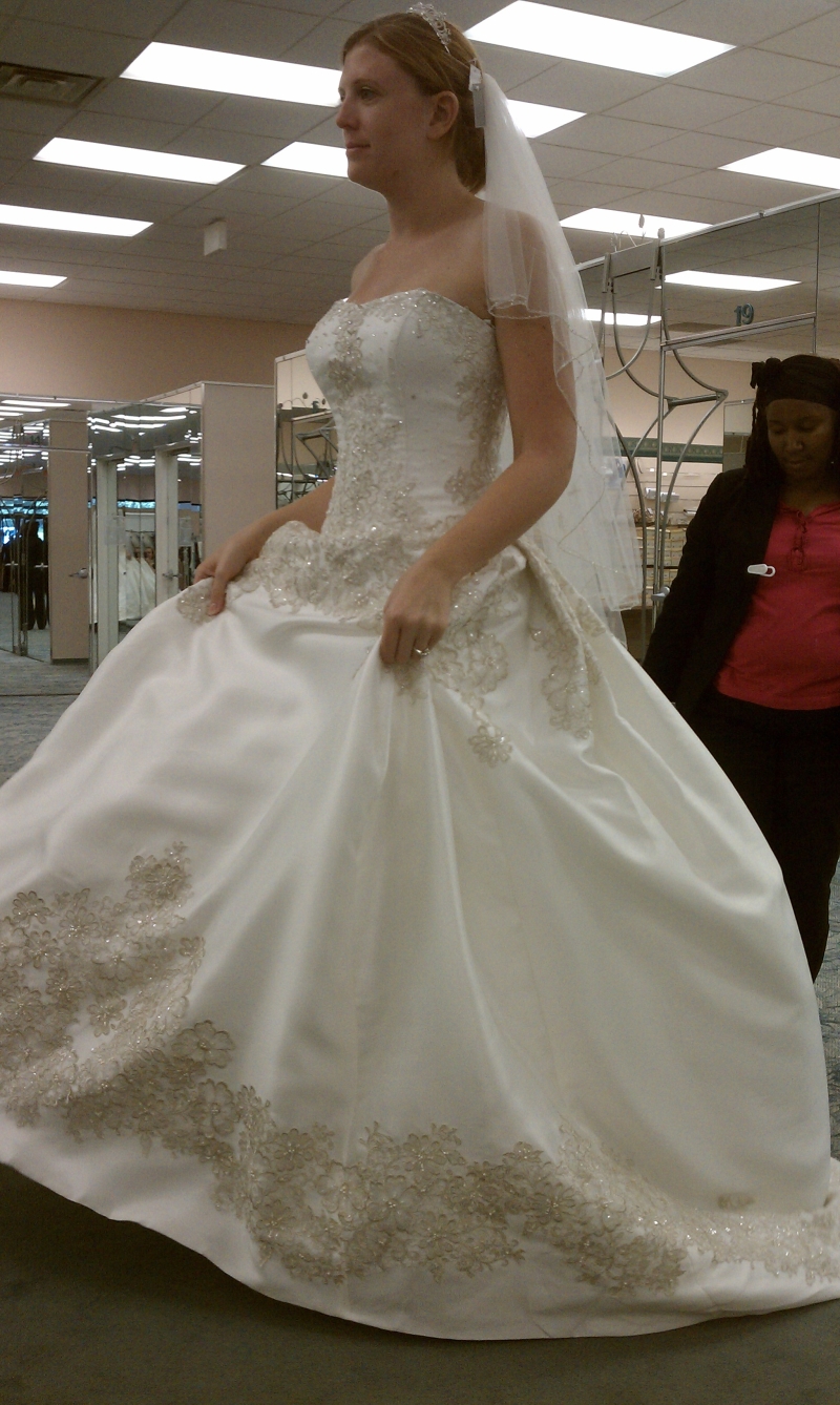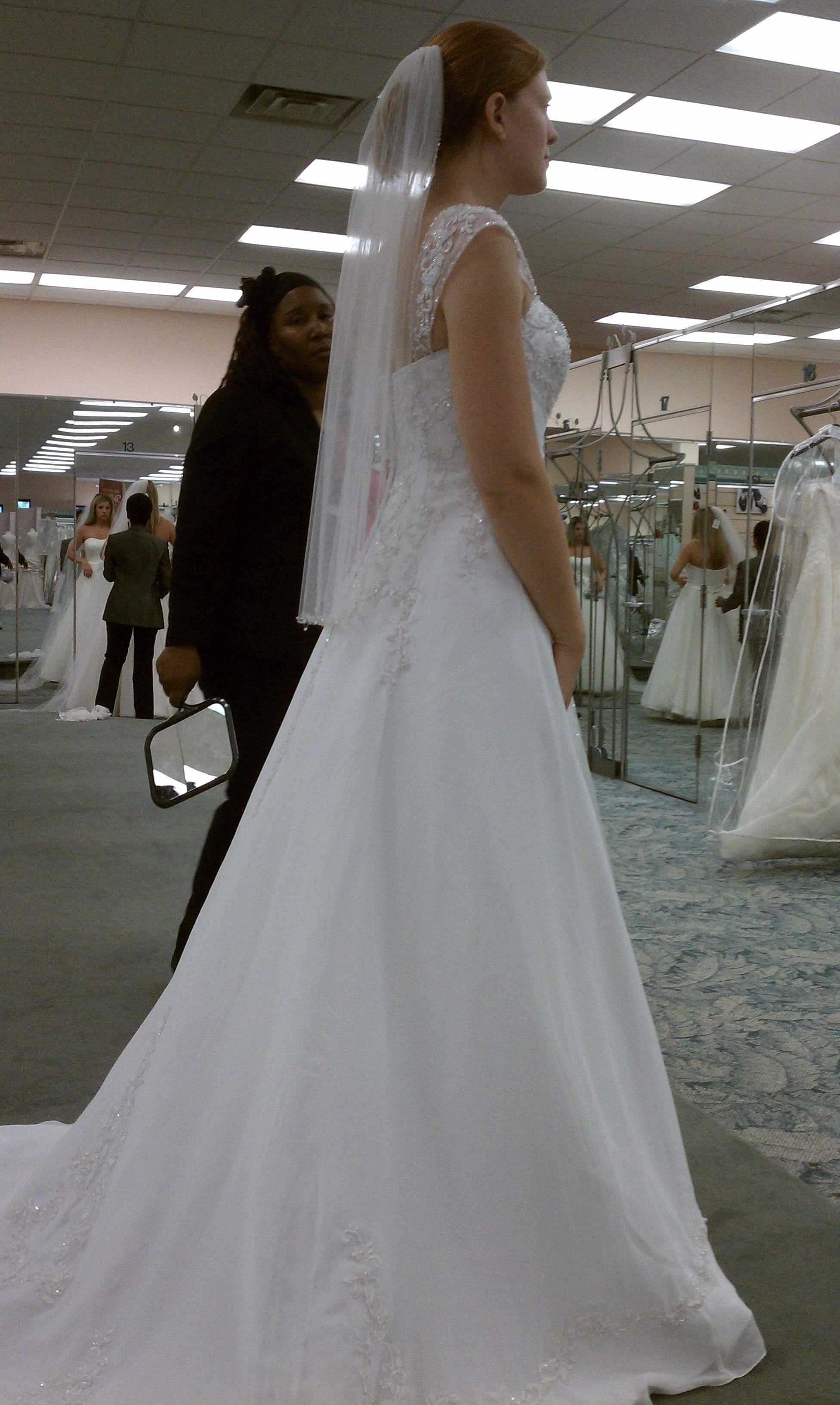After a lunch break, we continued our mission to David’s Bridal. It’s a national chain, which means they’ve got their marketing down pat. First, you have to fill out their forms and they shove a bag of materials at you in case you still need a photographer, a planner, a honeymoon, a cake or anything. Since I’m generally not a nice person, my internal actions included an eye roll and maybe a swear word. I sent Laura out to the car to get rid of the junk.