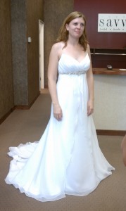 And so we did. We stopped first at A Bridal World, where I reviewed the dresses I’d seen with Ginny Saturday. I was relieved to see that none stood out like the Contender. On to the last store, Savvi Formal Wear. Of all the stores, I was least impressed with this one. The store and selection are small; I was told their main line is tuxedos and that most Savvi stores don’t carry bridal gowns.