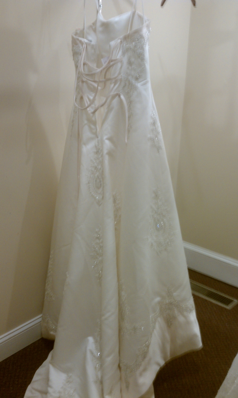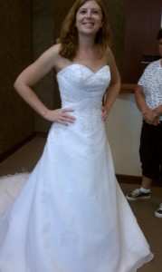 I began on a Saturday at A Bridal World with Best Friend and Maid of Honor Ginny Skalski. The mom-and-pop shop isn’t much to look at, but the selection is varied and the staff are extremely nice and patient with annoying and clueless brides like me. I stepped into and out of nine different dresses, experimenting with sleeves (no), a retro look (no) and more elegant, simple dresses.