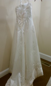 We’d arrived early, so we looked at the bridesmaid dress colors, but I was disappointed not to find the right shades of green, or anything close. But I did find several dresses to try on, including some from a designer I’d actually heard of, but no, none from Vera Wang.