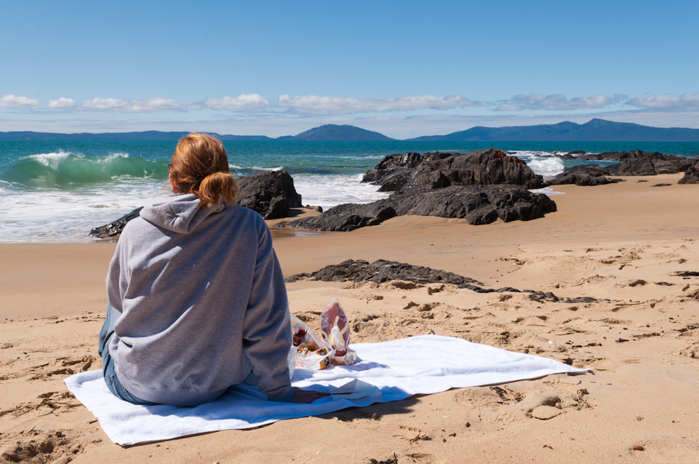 Ditto for the nearby Bay of Fires, so named for the red rocks along the shore. They have the same orange shade as Uluru, so Leo and I surmised they are similarly oxidizing. We climbed the rocks and watched the stunning ocean, the sun now a big yellow orb casting a path of diamonds up to the deserted beach. If only I could bottle up the air and the feeling we had standing there, on the edge of the world, watching the sun open the day… (See another picture on Leo’s flickr feed here.)