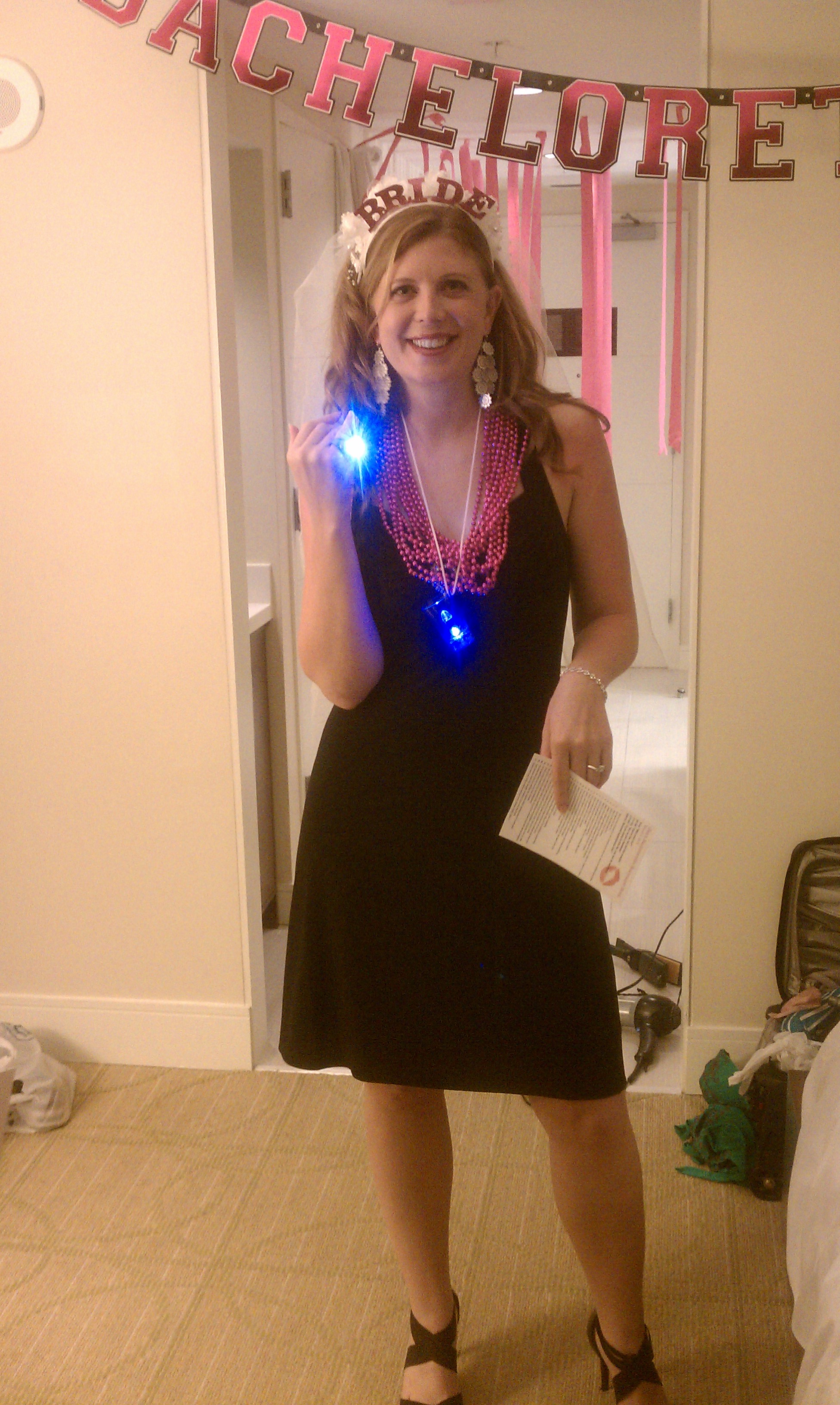 Ginny then grabbed her bachelorette party bag and proceeded to cover me in a stack of pink beads. Each girl was issued the same stack, with instructions to dole them out to boys if we so decided. We were also given plastic diamond rings lit up inside with LEDs. I was also issued a shot glass with another LED light that changed colors. And of course, the main touch: a headband veil with “Bride” in pink letters at the top, handcrafted by Ginny!