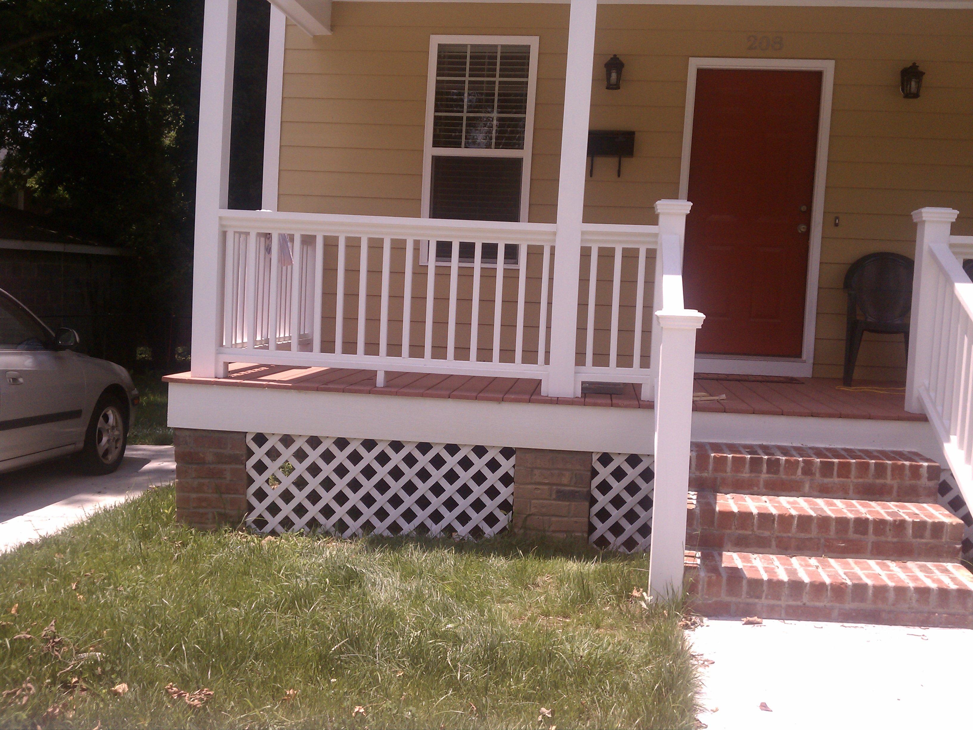 Our first semi-large project is in the works this weekend. The front of the house looks unfinished under the porch, like the gaps in an 8-year-old’s smile. So last weekend Leo and I bought and then painted some wooden lattice.