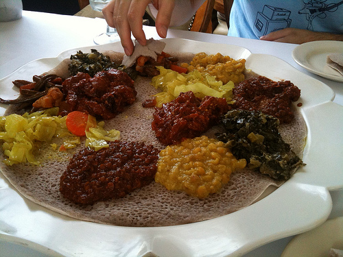The food was indeed delicious, but neither Leo or I had ever tried Ethiopian so I can’t say it was the best. 🙂 The place was a converted house, with strange seating. We shared small room with another couple and we all ate on a couch or lounge chairs around a coffee table. Ethiopian is served on a large, round silver platter. The dish is covered with spongy bread, upon which sits small piles of meat, vegetables and hummus. More of the spongy bread is rolled and placed in a basket. You grab a roll, unfurl it, rip off a piece and use that to scoop up a pile of something. It all tasted great and cost roughly $22 for three people with beer and wine.