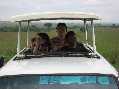 The weather was cool and the skies were gray. The van has a pop-up top so that you can stand and look out all around you; a brilliant idea when it’s not chilly and you’ve forgotten your jacket. 🙂 Still, the park was amazing. Leo made jokes about Jurassic Park as we entered, and it’s actually not dissimilar. (Except the lack of dinosaurs.) It’s 117 square kilometers, mostly wide open grasslands with short bushes.