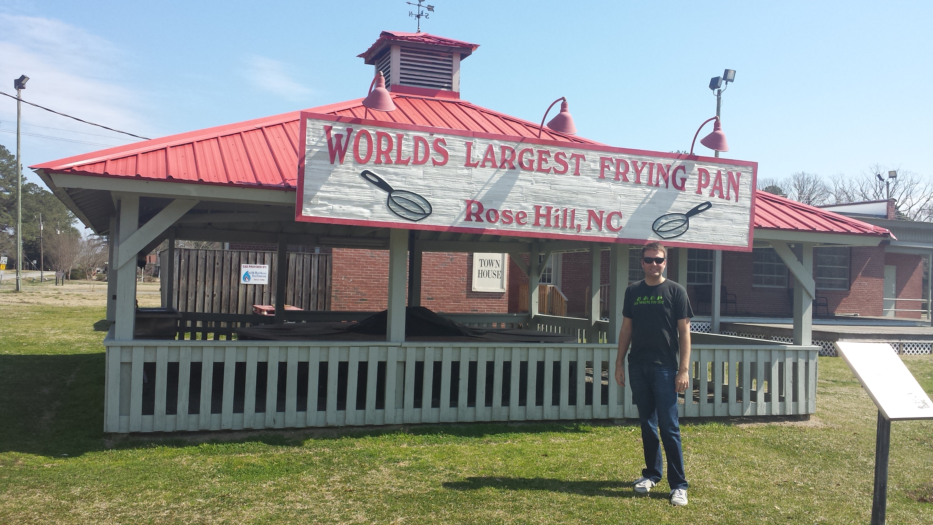 Instead, the World’s Largest Frying Pan in Rose Hill, N.C. is a flat pan lying under a small shelter. It stands a few feet off the ground and is divided into several sections. Frankly, it didn’t look like much.