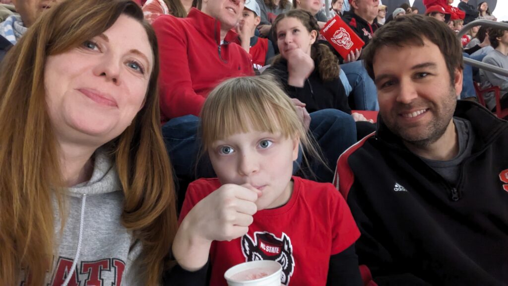 Today, we went to an NC State game and got Howling Cow Strawberry Ice Cream. At the game, NC State was playing against Duke, and it was a women’s basketball game and we found out that there was Howling Cow Ice cream. The flavors were strawberry, chocolate, and vanilla. We got all three of them and ate them together.