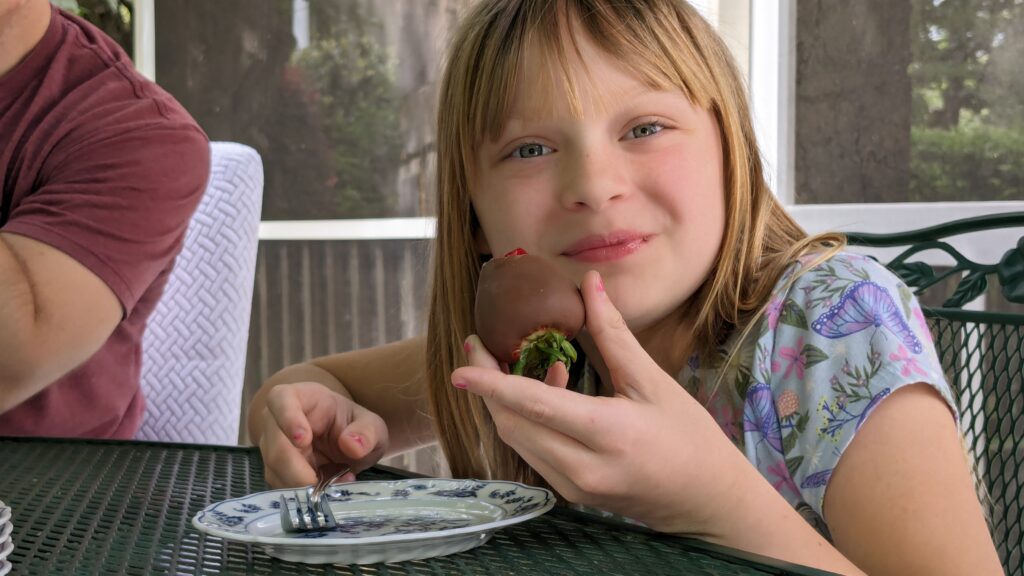 We picked up a dozen strawberries, half with milk chocolate and the other with dark from the Chocolate Boutique. The chocolate was excellent and it was an easy one for the kids.