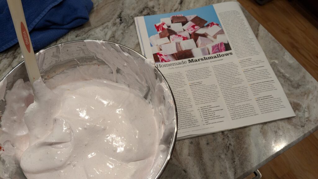 In reality, we had to adjust this one to count is as part of our dessert challenge. No one sells marshmallow twists, at least that we could find. Luckily, I subscribe to a cooking magazine that had a recipe for homemade marshmallows. One of the options is to add freeze-dried strawberries and some lemon zest, so I figured that would do nicely.